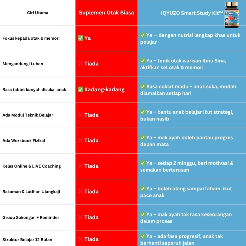 Gabungan suplemen dan teknik belajar ini menyokong perkembangan minda pelajar secara semula jadi dan bantu anak anda lebih bersedia menghadapi peperiksaan dengan keyakinan.