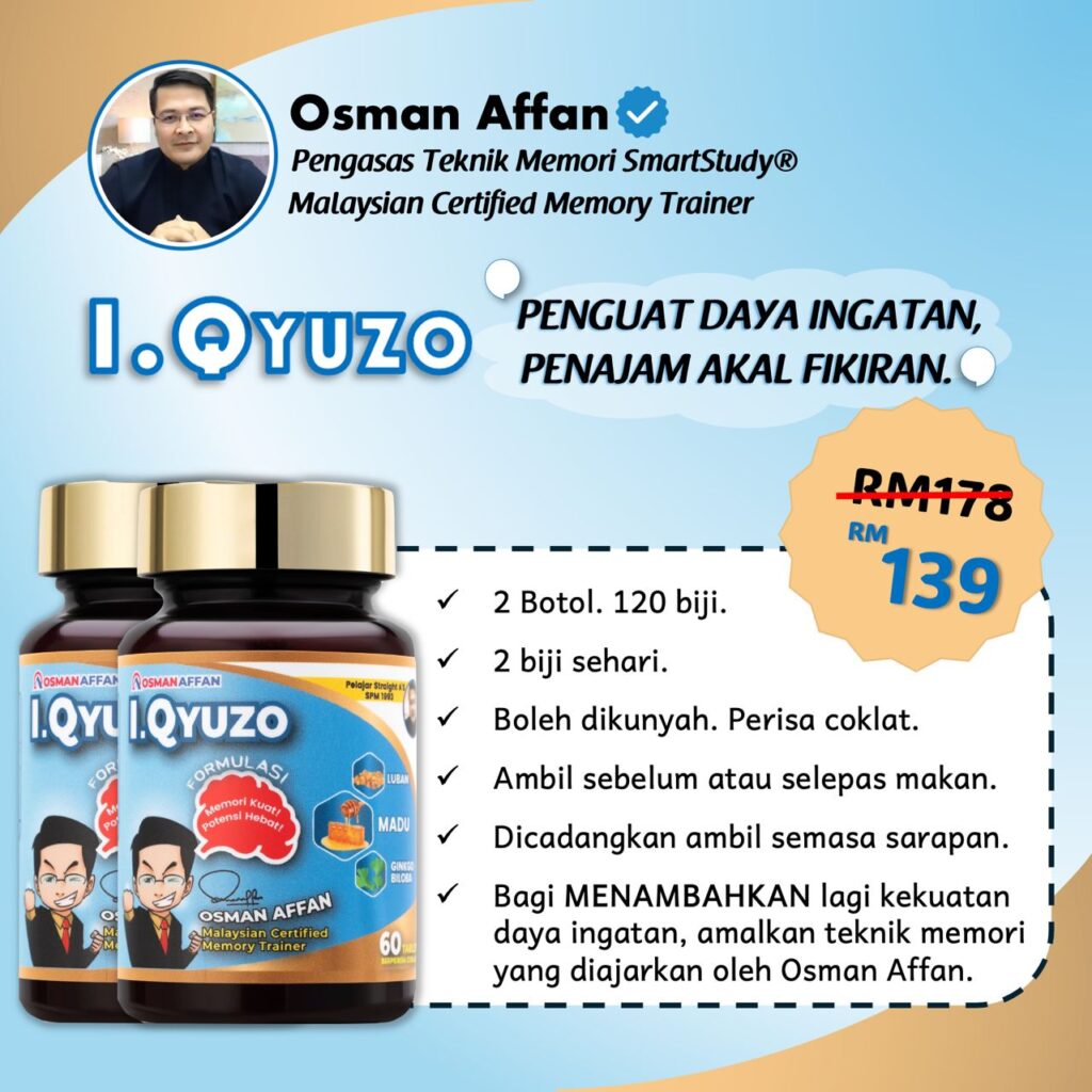 Osman Affan ialah seorang Certified Memory Trainer, penulis lebih 10 buku teknik belajar, dan pengasas sistem IQYUZO SmartStudy™ KIT. Beliau dikenali ramai sebagai pelopor teknik belajar moden yang terbukti membantu pelajar lebih fokus, konsisten dan berjaya dalam peperiksaan.